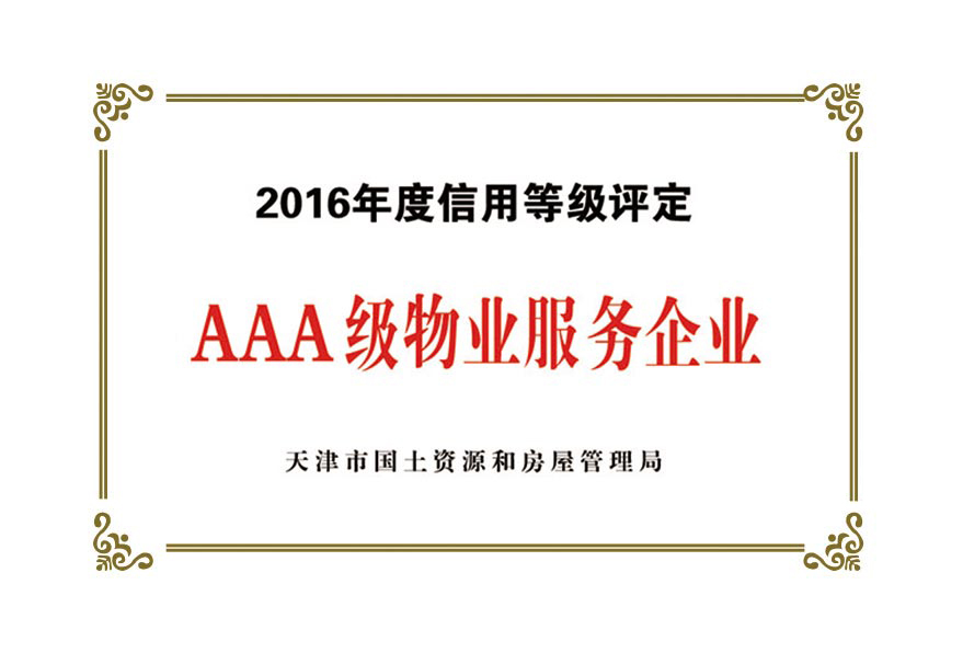 公司目前被授予:中國保安協(xié)會理事單位、物業(yè)管理綜合實力入圍企業(yè)、天津市物業(yè)協(xié)會理事單位、天津市保安協(xié)會常務(wù)理事單位、天津市保潔協(xié)會明星企業(yè)、天津市科技小巨人企業(yè)、天津市科技型企業(yè)、天津市物業(yè)管理企業(yè)優(yōu)秀項目經(jīng)理、企業(yè)信用評價體系A(chǔ)AA級企業(yè)、AAA級誠信經(jīng)營示范單位、AAA級重合同守信用單位、2017年被天津市工商業(yè)聯(lián)合會評為天津市民營企業(yè)促進就業(yè)百強企業(yè)、社會捐贈百強企業(yè)、2018年銷售收入百強企業(yè),2020年被天津市退役軍人事務(wù)局評為天津市吸納退役軍人就業(yè)先進單位。